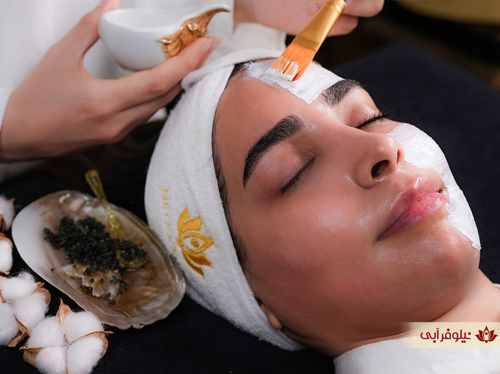 ماسک خاویار – استراحت پوست با ماسک غنیشده به مدت ۱۵–۲۰ دقیقه.
